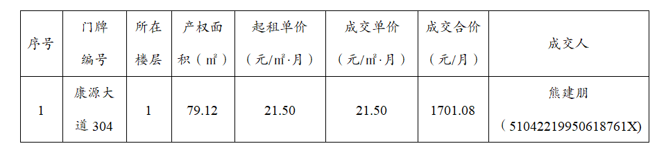 合盛·康悦商铺公开竞价招租于2025年12月11日上午9时30分在攀枝花合盛工程建设开发有限公司〔攀枝花市东区东华街道机场路149号(攀枝花万达广场上行100米金泰悦城5楼)〕进行了公开竞价,现对竞租结果进行公示: