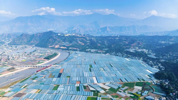鸟瞰紧邻米易县城的万亩蔬菜种植产区。这里位于安宁河畔,光热资源丰富,适宜于作物生长。这里正在打造集观光、文旅为一体的现代农业产业体系。